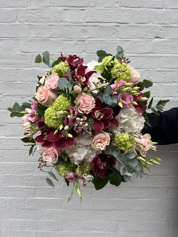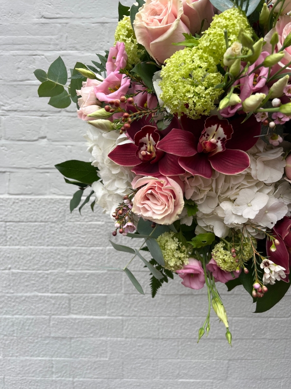 Our Orchid Opulence arrangement features the exquisite Cymbidium orchid, beautifully complemented by a soft mix of pinks and whites in gentle pastel tones. Luxurious yet understated, this bouquet celebrates the timeless beauty of orchids — a stunning statement piece for any occasion.