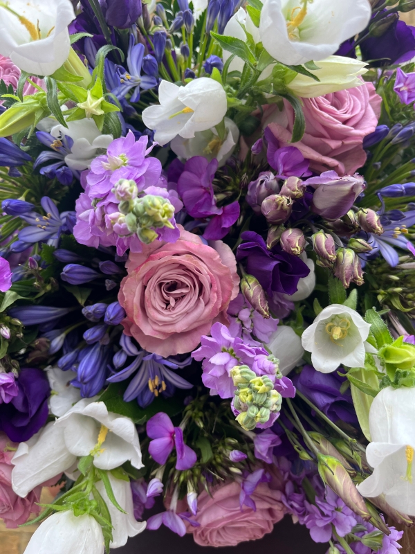 Graceful and refined, our Amethyst Bouquet is a serene blend of lilacs, purples, and delicate touches of white — a calming palette that brings a sense of balance and beauty to any setting. Thoughtfully composed to evoke quiet sophistication, this arrangement adds a gentle, timeless charm to your space.