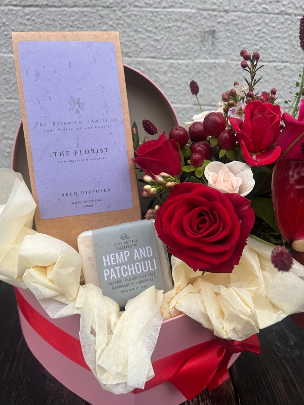 A thoughtfully curated heart-shaped hat box gift hamper designed to delight. This elegant set includes a small floral arrangement presented in a glass jar vase, paired with two carefully selected gift items chosen by our florists — such as a luxury soap, candle, or diffuser.