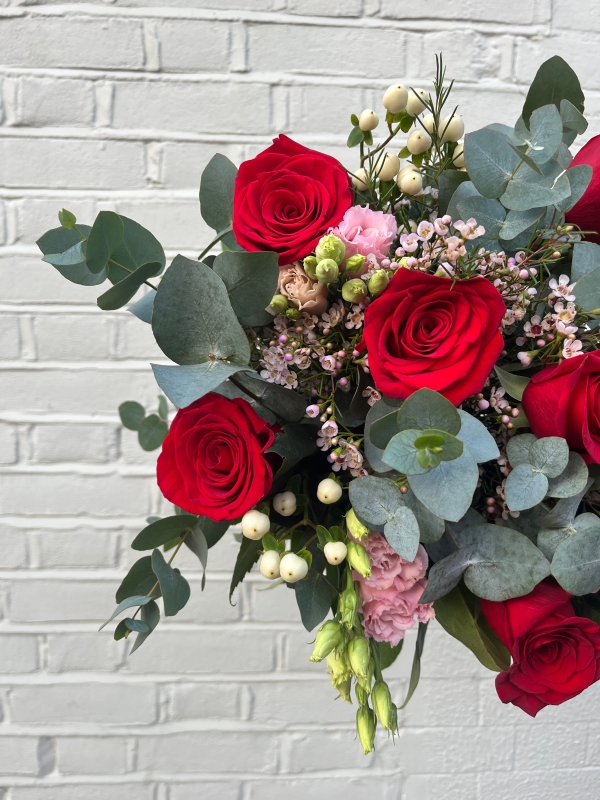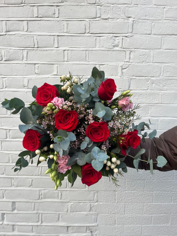 Gentle Romance features a curated mix of roses in red, pink, and white tones, paired with seasonal florals and textured greenery. Designed to feel light, graceful, and naturally flowing, this bouquet is perfect for romantic gestures and elegant celebrations.