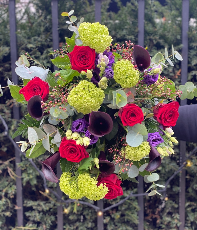 This beautifully layered arrangement brings together rich tones of deep reds and velvety purples, softened with fresh greens and delicate touches of white. Thoughtfully styled with seasonal, textural florals and flowing movement, Naomi Knights has an elegant, garden-inspired feel that’s both timeless and enchanting.
