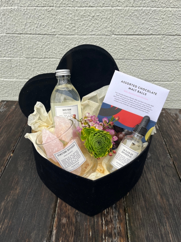 This elevated hamper includes a nourishing bath foam from Norfolk Living, a rose quartz gemstone diffuser with diffuser oil, a box of assorted chocolate malt balls from The Chocolate Society , and a small selection of fresh seasonal flower stems for a soft floral touch.